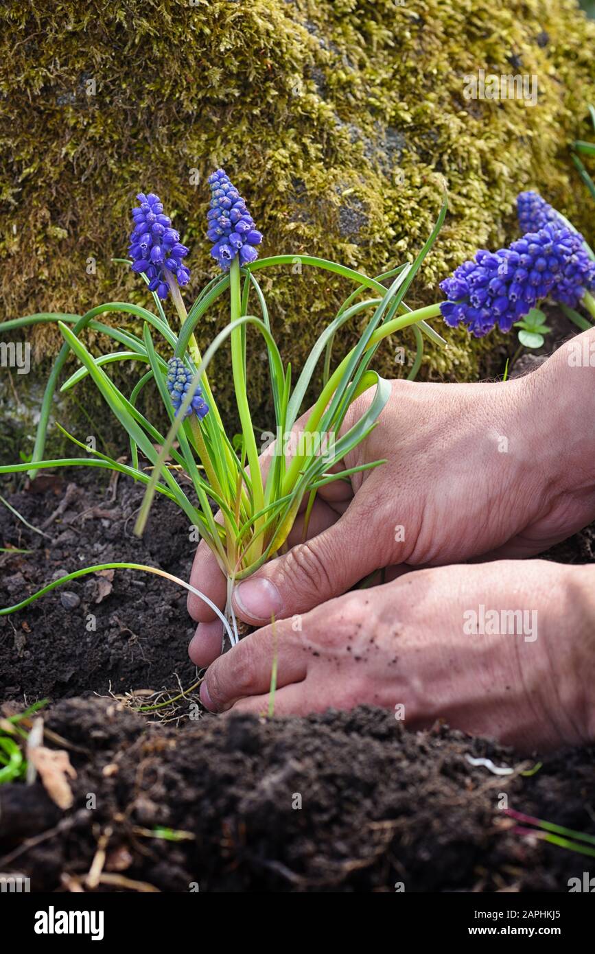Gardener Planting Muscari Flowers In The Garden Spring Garden