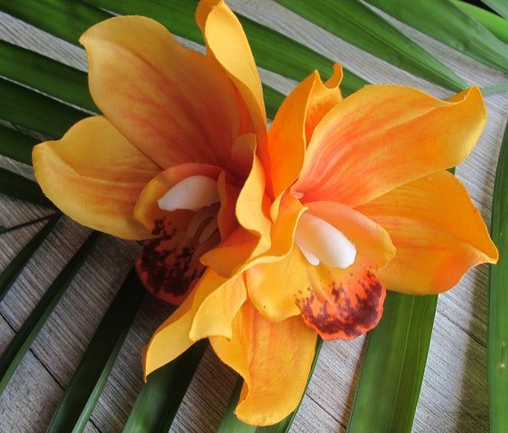Hawaiian 0range Two Orchids Hair Flower Clip Weddings Etsy