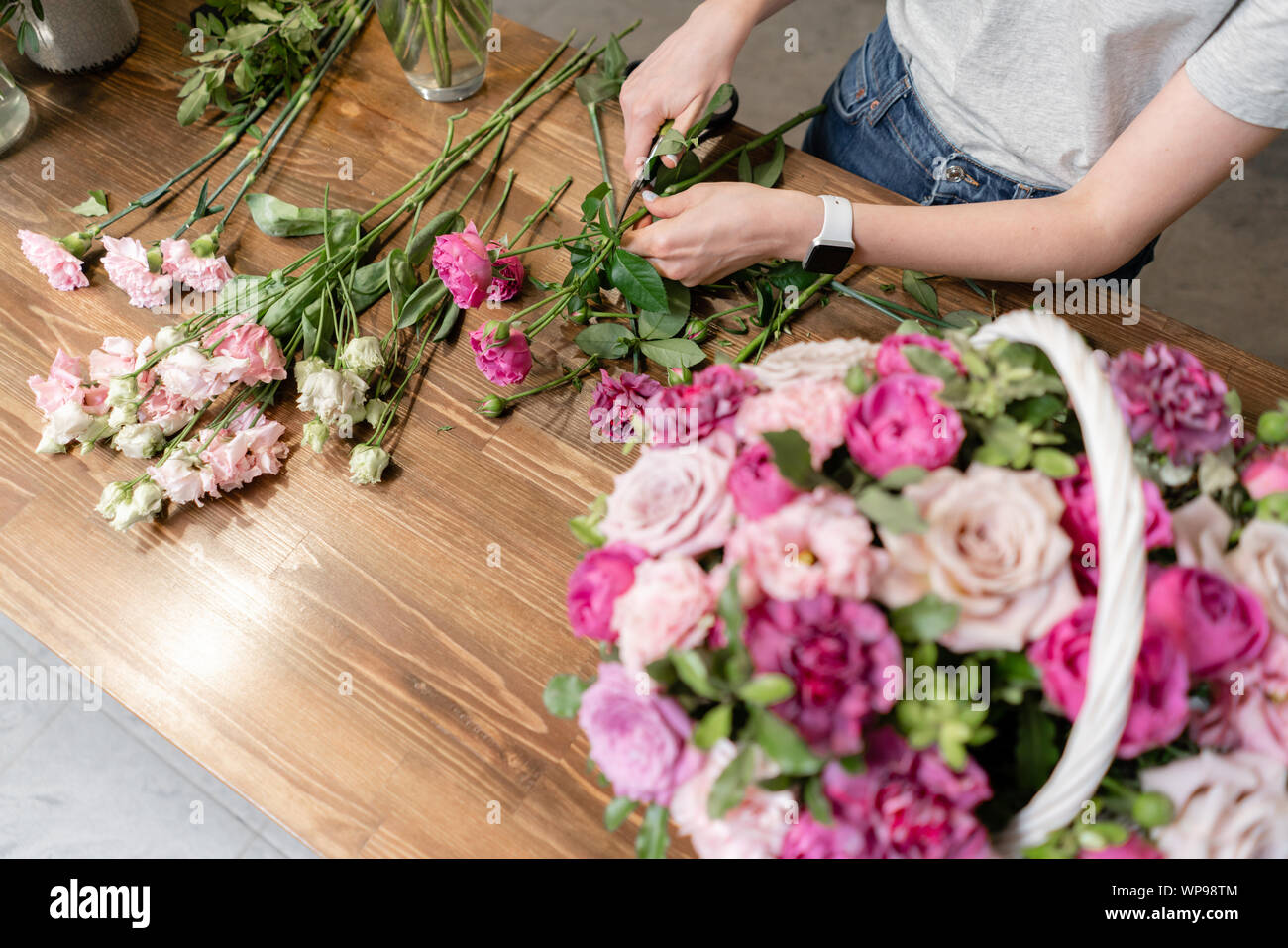 Woman Florist Create Flower Arrangement In A Wicker Basket